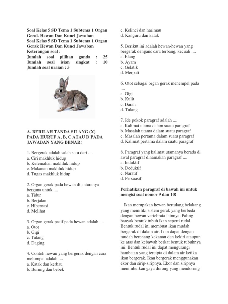 Jika berdasarkan dengan jenisnya hewan sendiri dipisahkan ke dalam dua kelompok. Soal kelas 5 tema 1 akan membantu anak dalam mendalami mata pelajaran Ilmu Pengetahuan Alam IPA yang telah diajarkan. Organ gerak kelinci adalah kaki jumlahnya 4.